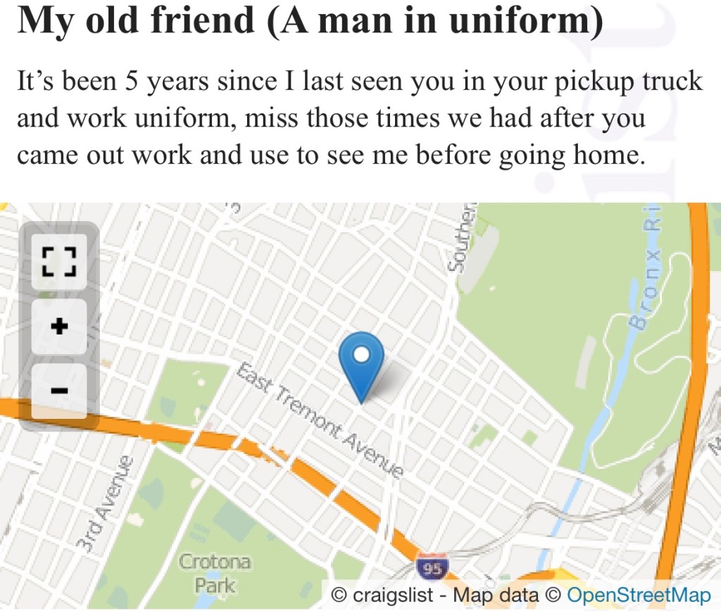 I would like to conclude with this one. Craigslist is a lonely place, and every post has such an air of desperation enveloping it. Its addicting to me and I can spend hours upon hours reading through posts. I just imagine the kind of person who wrote it. I think I have a tendency to romanticize people in that way. I’m never bored of people watching, even if it’s just the cave paintings they leave behind on the bathroom stall of the internet (Craigslist.) Obviously to me, each and every post tells a story about someone who wants or needs someone for something and can’t get it by any other means. It’s easy to brush these people off as creepy or psychotic. I’d like to assert the opposite. These people are genuine and brave for being able to turn their soft underbelly up towards a world that isn’t made for people who fail at the ‘easy stuff.’ It’s strange that we all go along with all the vague messages in communication, business, education that are broad in scope but narrow in purpose. Its strange that while the majority of craigslist is “m/f searching for hot trash skanks.’ there are people who just wanna hang out, sell a cage or save the world among all that noise. I challenge you to take a look at your local craigslist community tab, read through it and be a bit more vulnerable to the unabashed, and maybe make an offer.